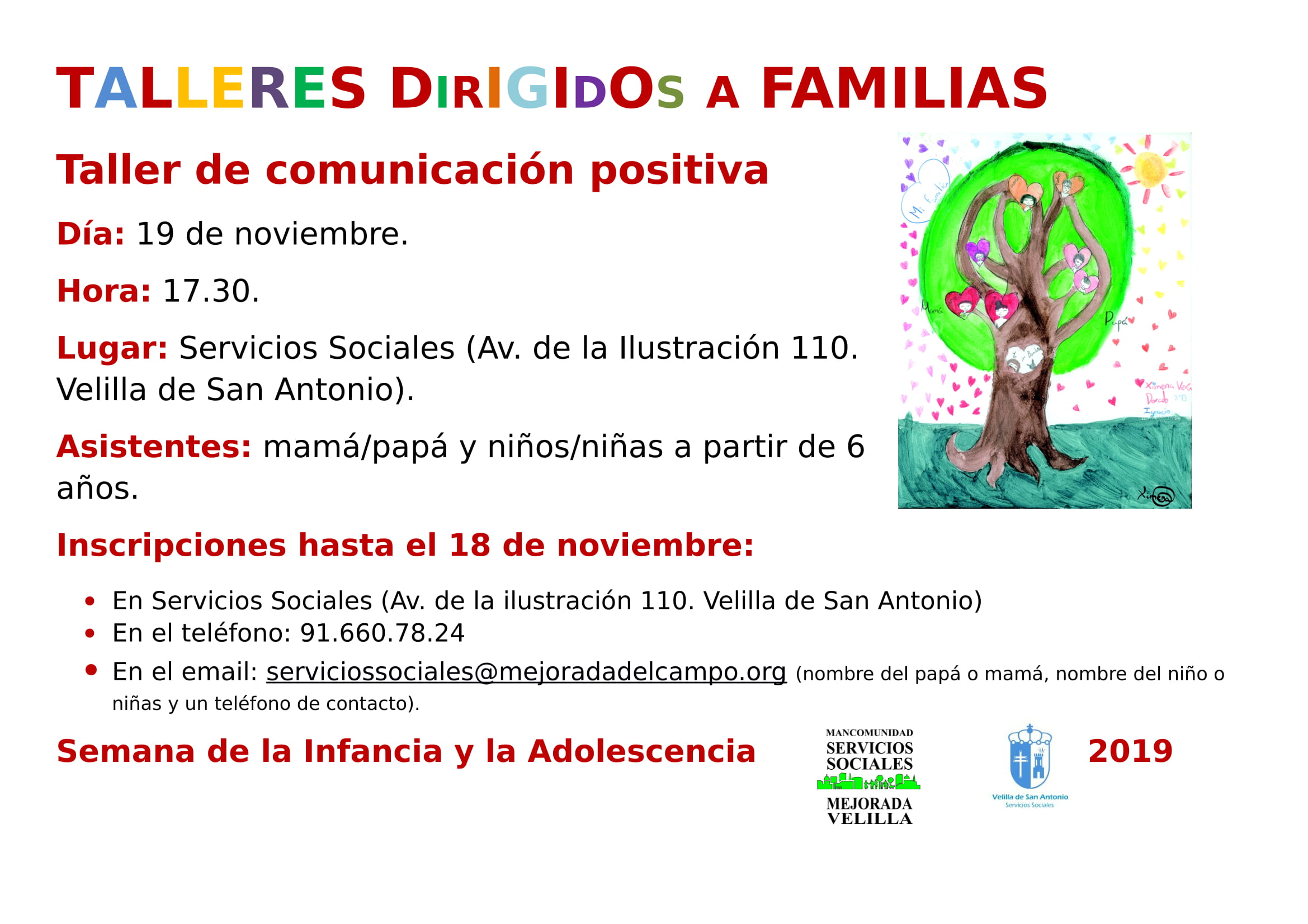 Se han organizado dos talleres dirigidos a familias para conmemorar los Derechos de la Infancia. Como ya sabéis este año las FAMILIAS son protagonistas porque tratamos con especial interés el DERECHO A TENER UNA FAMILIA. Son: